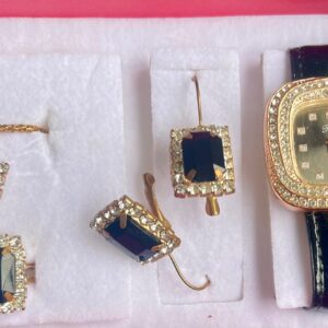 Elegant women’s jewelry & watch gift set with black gemstone pendant, ring, earrings & rhinestone-studded black watch.