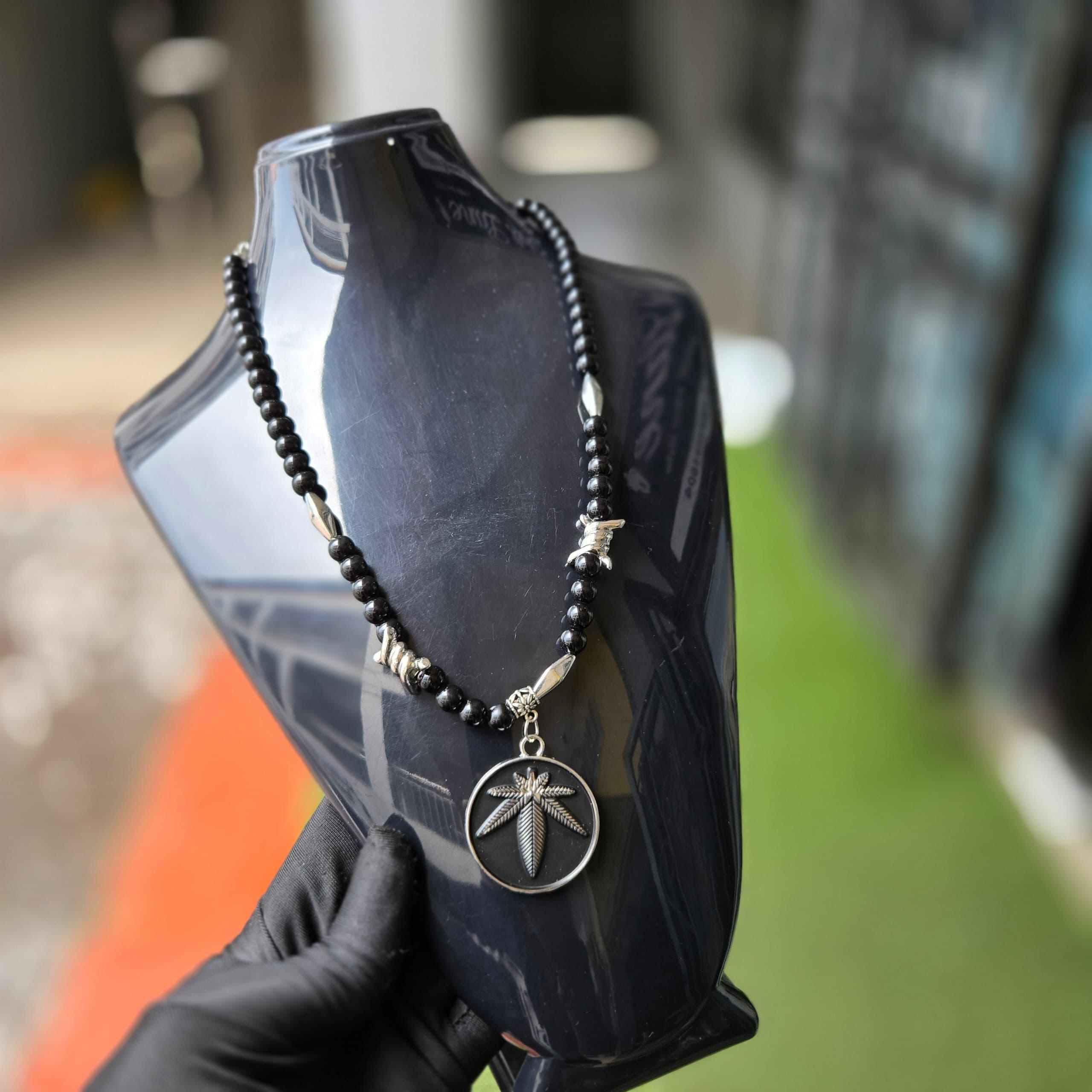 This stylish necklace showcases polished black beads and a silver-toned pendant shaped like a leaf inside a circular frame. Perfect for casual or streetwear looks.