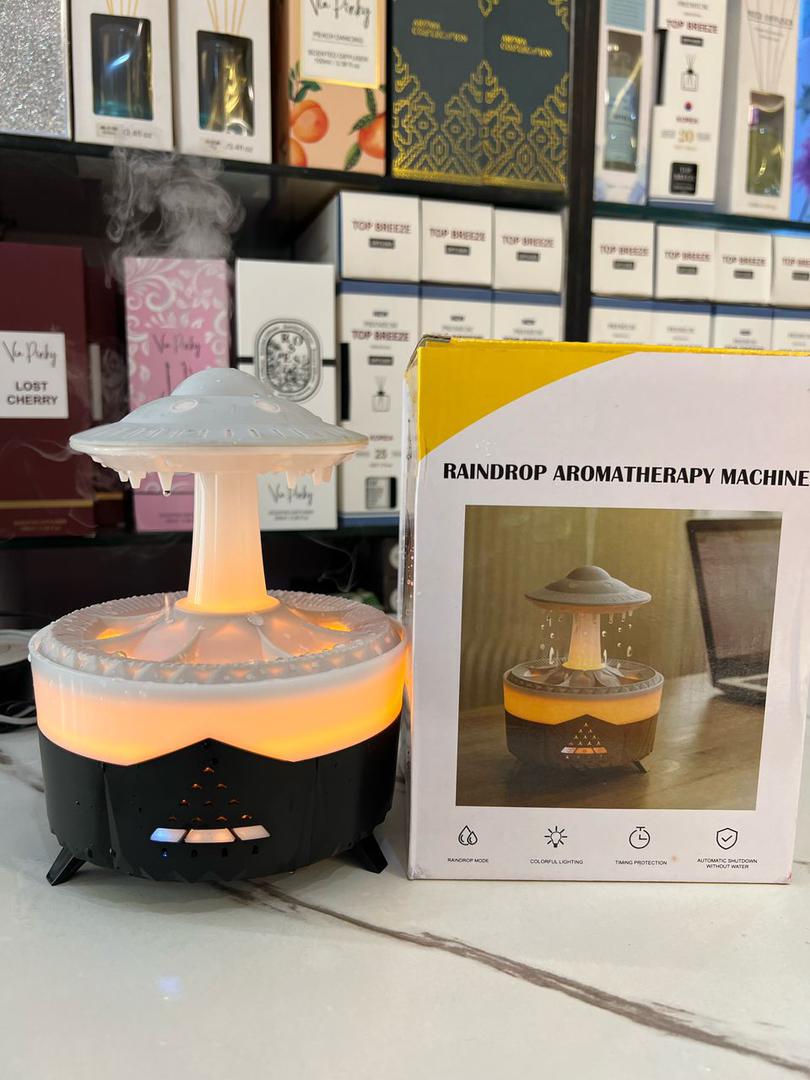 Raindrop-shaped aromatherapy machine with mist and light functions.