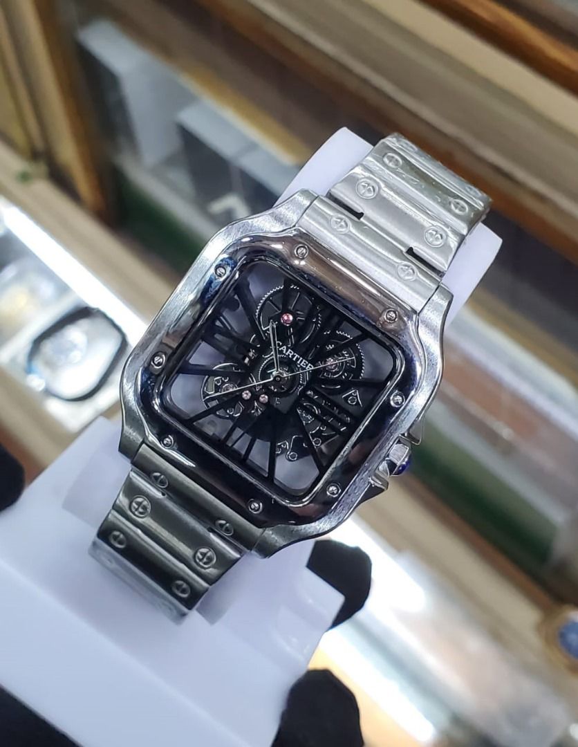 Premium Cartier-inspired skeleton wristwatch with stainless steel strap and visible mechanical movement. Bold square case, analog display, and detailed gear design showcase elegance and craftsmanship.
