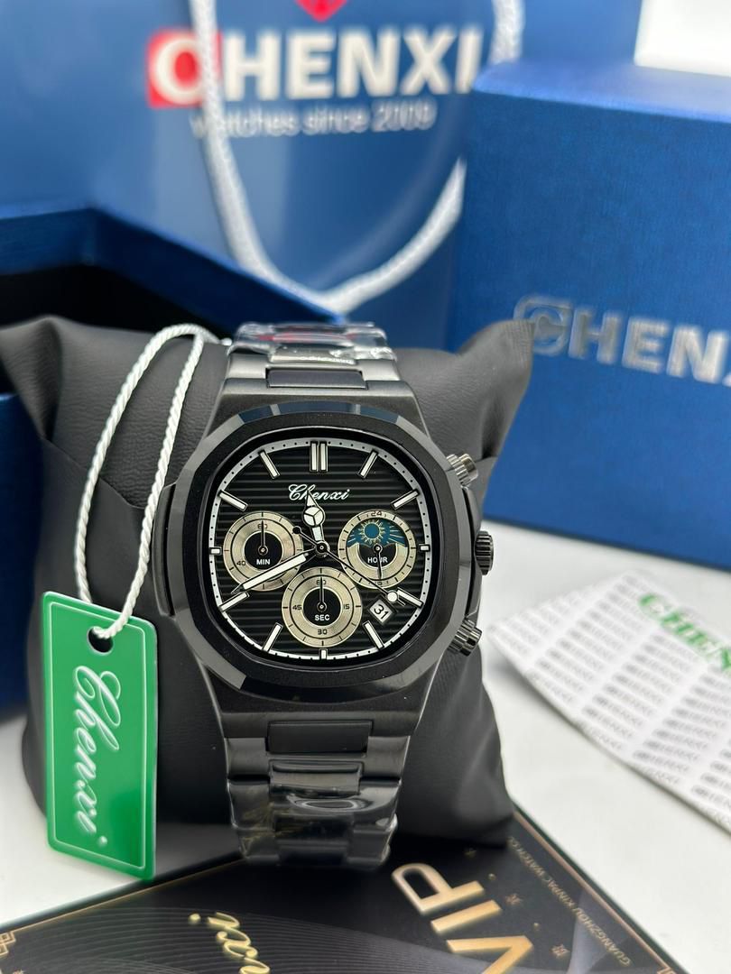 CHENXI Luxury Chronograph Men’s Watch stands out with its bold black dial and silver sub-dials for minutes, seconds, and hours. It features a stainless steel strap, luminous markers, and a date window. The watch is encased in a stylish black finish, suitable for both business and everyday wear. A statement piece for modern gentlemen.