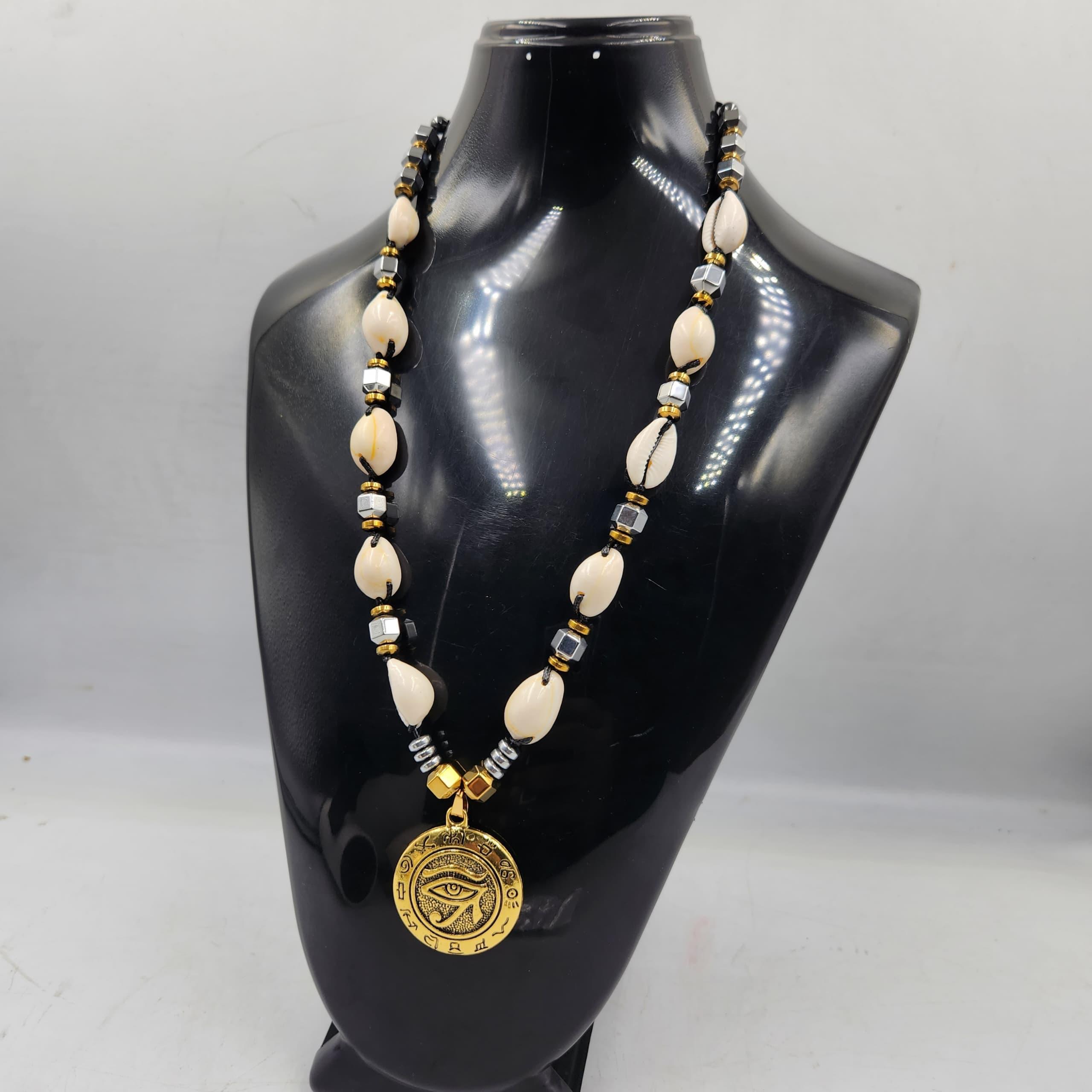 Bold cowrie necklace featuring a golden Egyptian Eye coin pendant, symbolizing protection and spiritual vision.