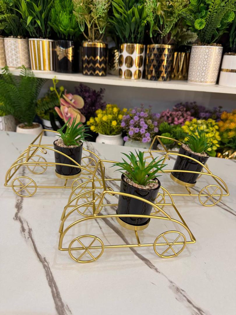 Fun and creative car-shaped planter set in a luxurious gold metal finish. Adds a playful yet elegant touch to indoor plant display.
