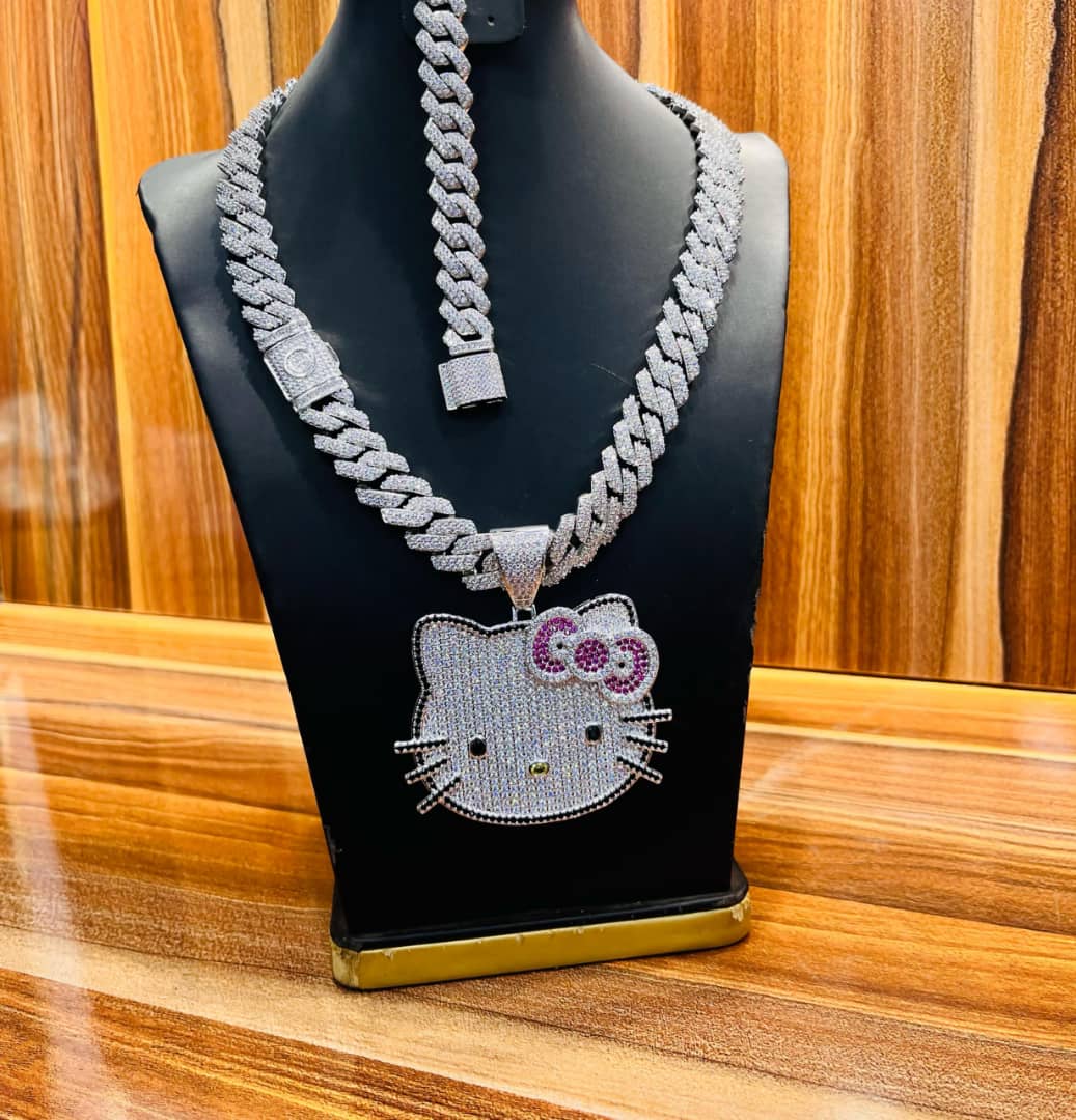 This dazzling iced-out jewelry set features a bold Cuban link chain with a sparkling Hello Kitty pendant and a matching wrist accessory, perfect for standing out in any crowd.