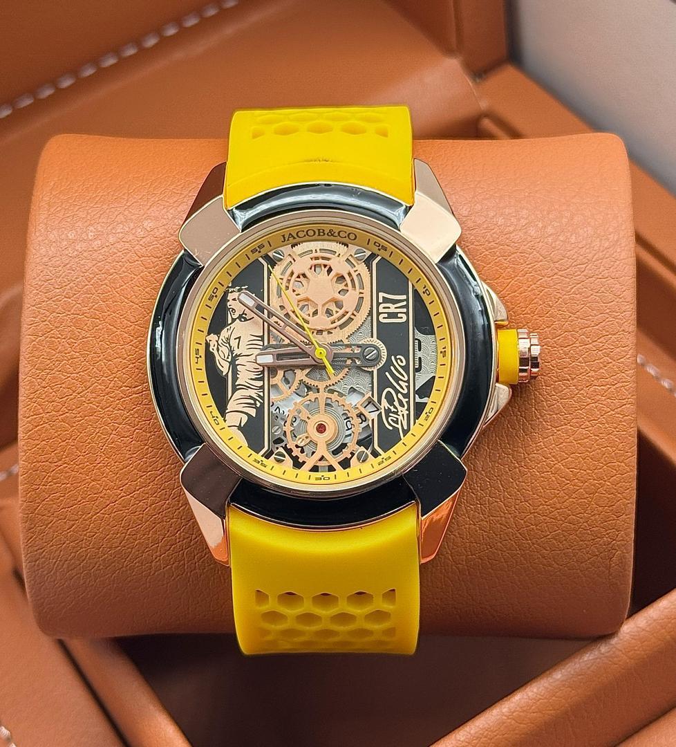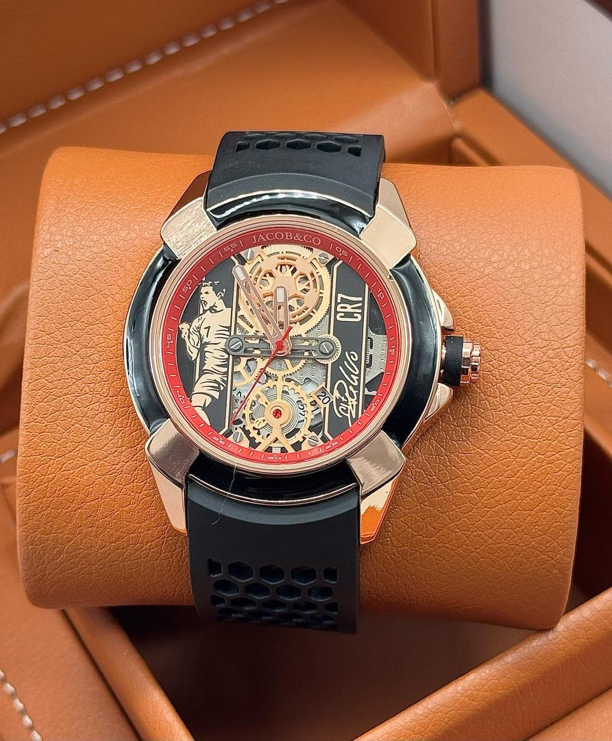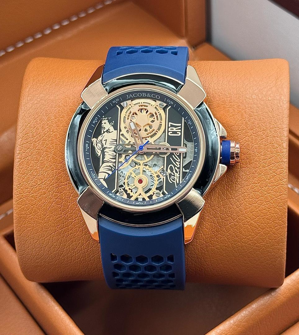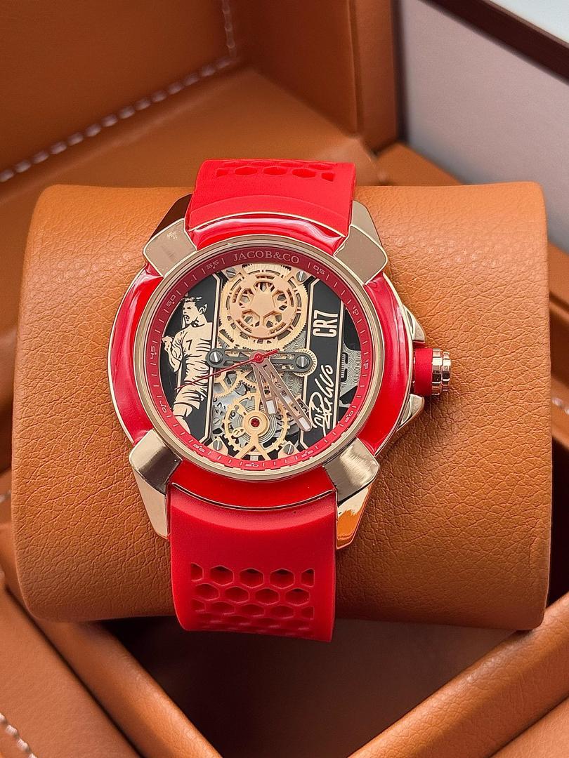 Limited edition Jacob & Co CR7 wristwatch with a mechanical display, available in various strap colors. An iconic piece combining luxury and sports legacy.