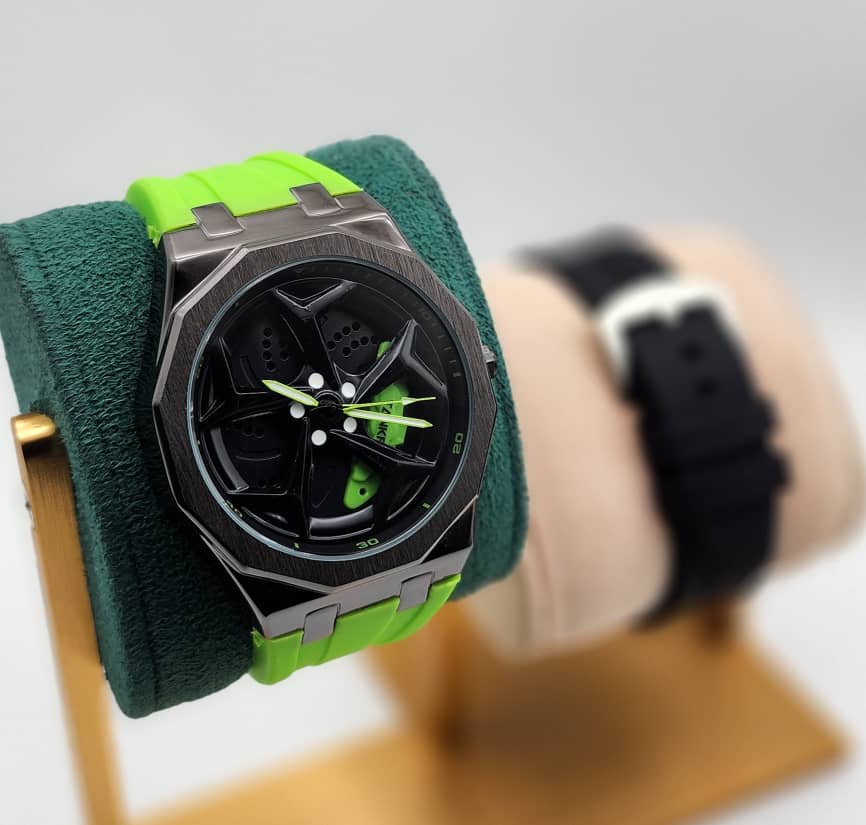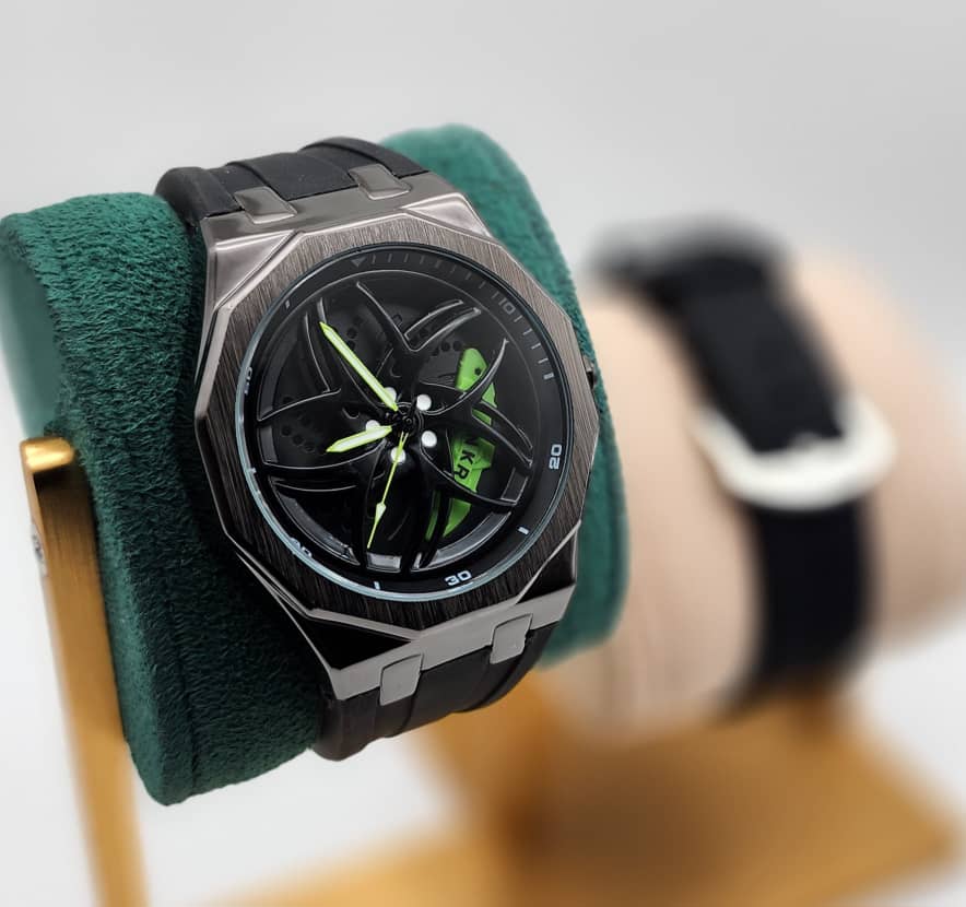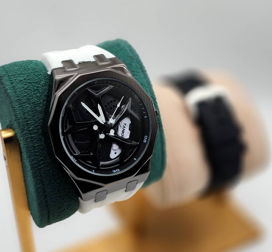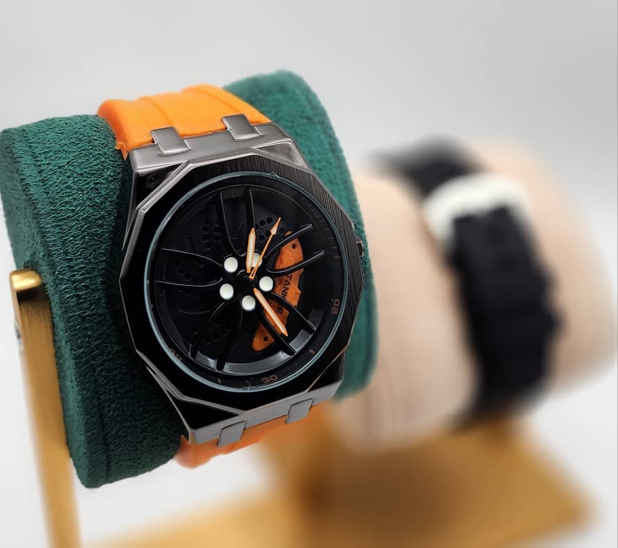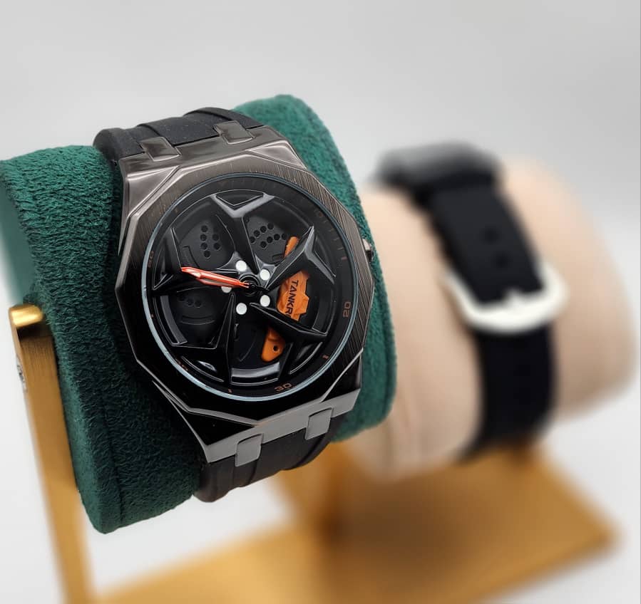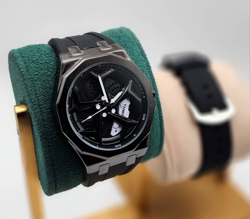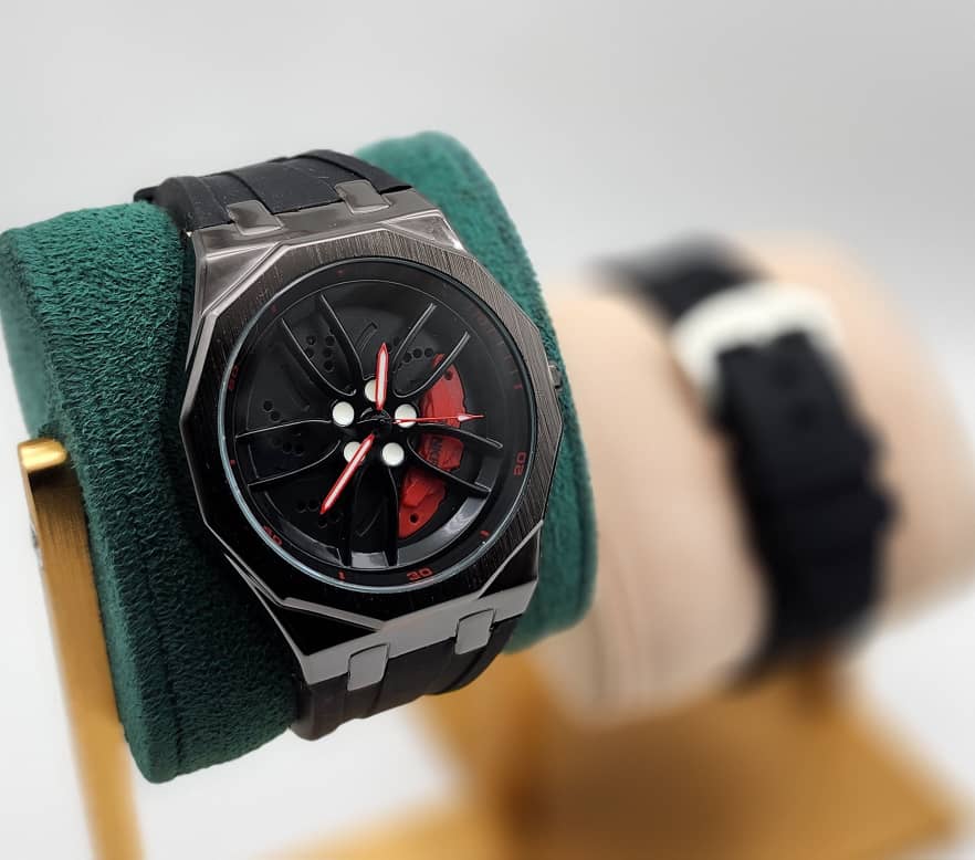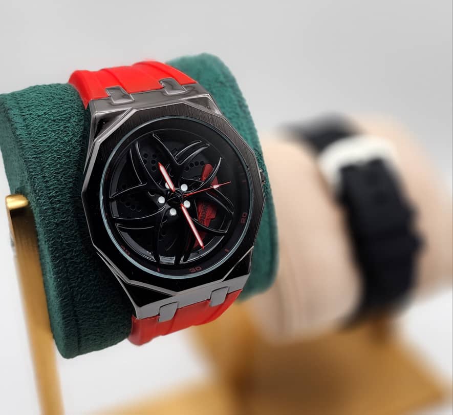 This luxury sport watch is crafted with a striking wheel-spoke design on the dial, highlighted by bold black and red tones. Perfect for men who love cars, speed, and statement fashion. Comes with a strong rubber strap for comfort and durability.