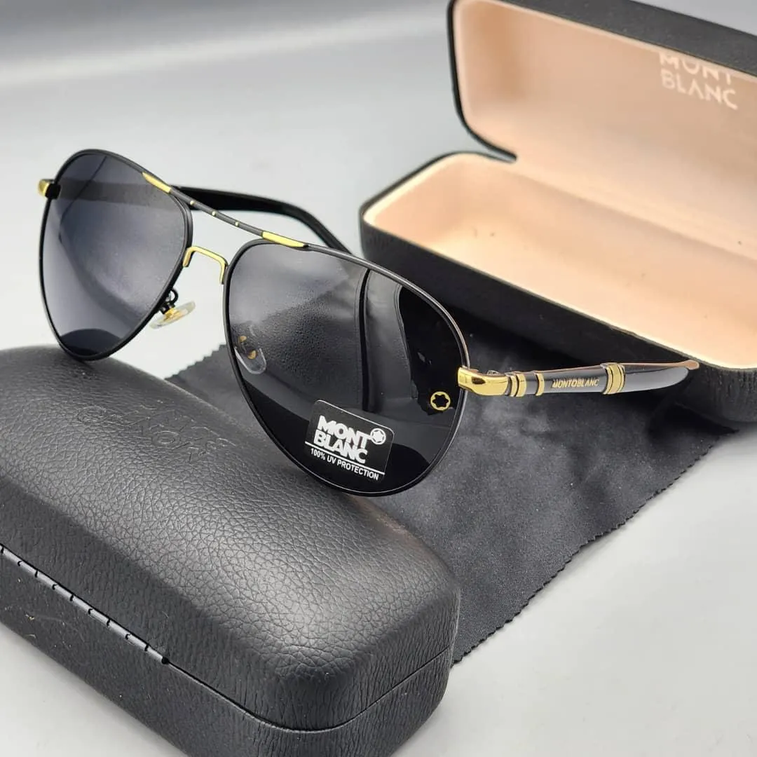 Step out in style with these Montblanc-inspired aviator sunglasses featuring a classic black and gold color scheme. Engineered with 100% UV protection lenses and lightweight metal frames, these sunglasses deliver both fashion and function. Ideal for both casual outings and upscale events, they come with a premium Montblanc-branded case for safe storage.