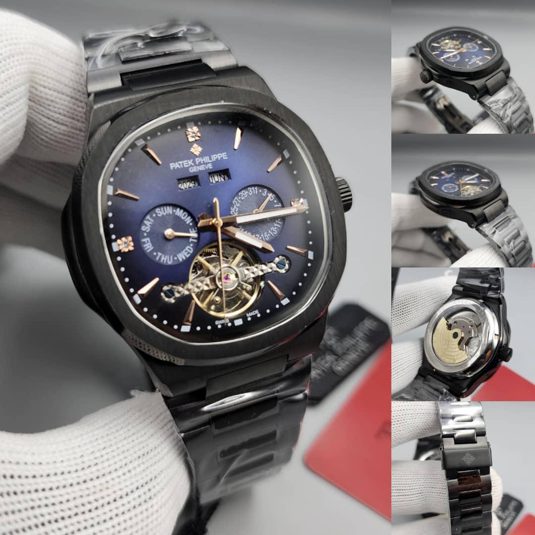 This premium Patek Philippe timepiece features a striking black stainless steel body and bracelet, with a deep blue dial showcasing a visible tourbillon mechanism. Day, date, and month displays enhance its utility, while rose gold accents offer an exquisite finish.