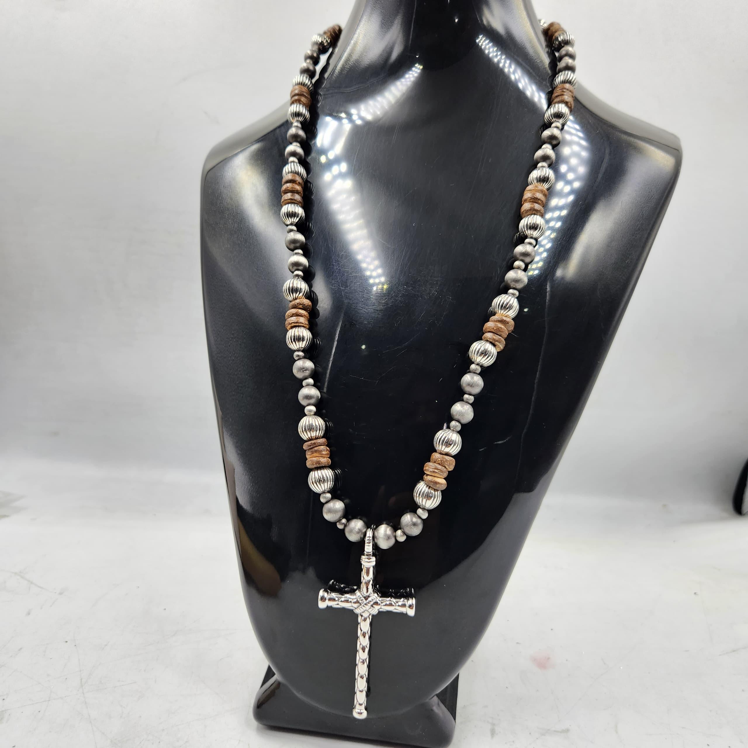 Earthy wooden beads alternate with metallic accents, culminating in a bold silver cross pendant. A perfect accessory for rugged, rustic style.
